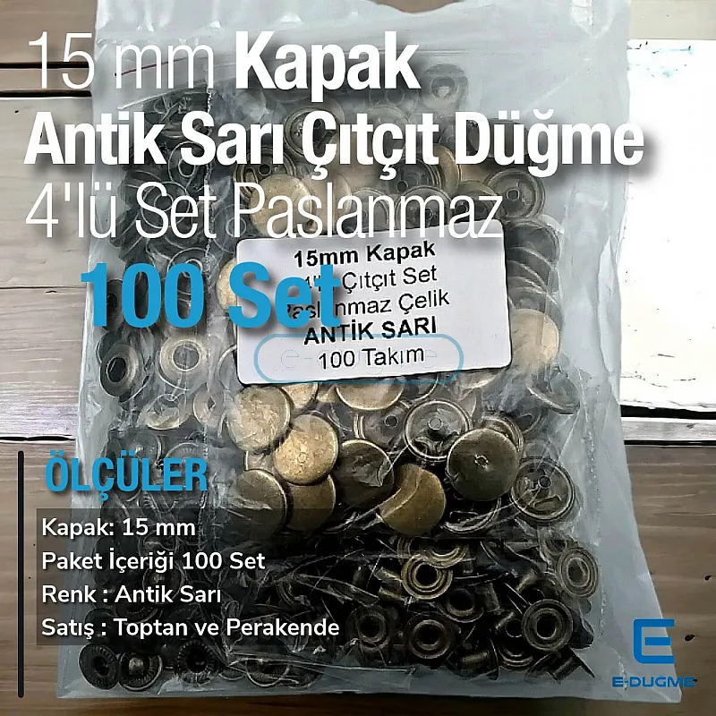 15 mm - 0,59" Snap Fasteners Stainless Antique Brass Color 100 pcs/Pack C00016PPKAS