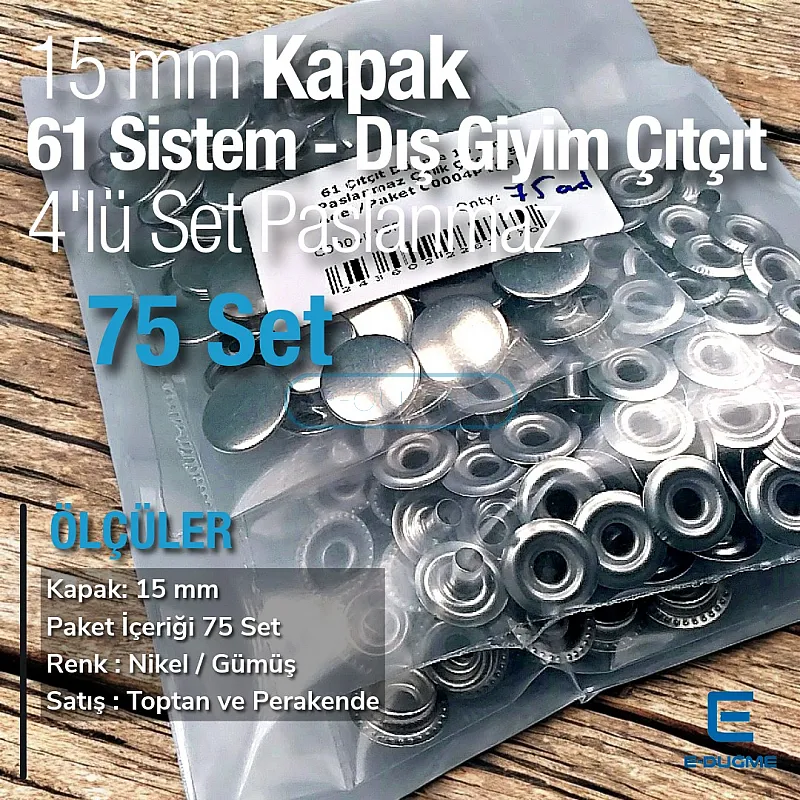 61 system cover is made of stainless brass material. The product is rust resistant. Mini 61 coin type slightly curved snap fastener functions as a material that allows the closing and opening of button shirts, bodysuits, jean shirts and baby and child products by overlapping the two edges of the fabrics. It is used as an alternative to zamak product.