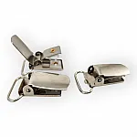 This metal pacifier clip, otherwise known as a suspender clip, has a 25 mm eye opening for straps and come equipped with a built-in PVC plastic teeth insert to protect fabrics from being damaged. Outside : 15mm x 35mm Inner : 25 mm Mouth Opening: 6.5 mm..